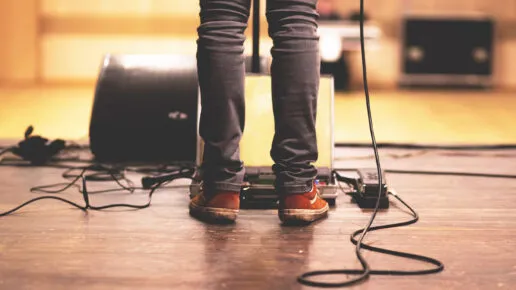 Midge and I don’t talk much while we untangle wires, but I can see his hands are shaking as much as mine. By the time we’ve got the guitar, bass and mic wired in downstairs, Anwar and Joey have set up the drum kit.